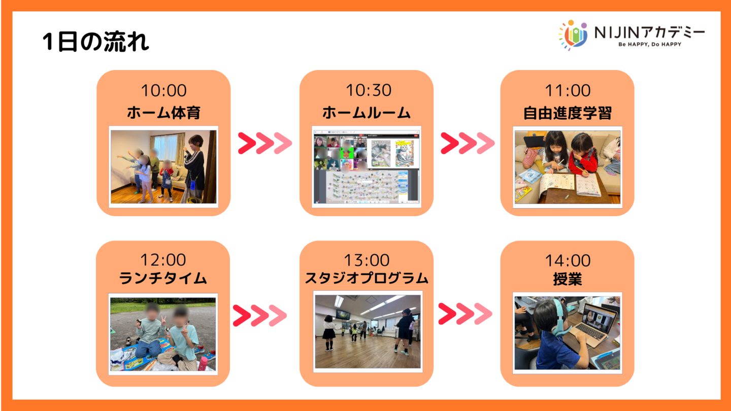 | 9:30 | 【登校の時間】 NIJINアカデミーでの1日の始まりです。 |